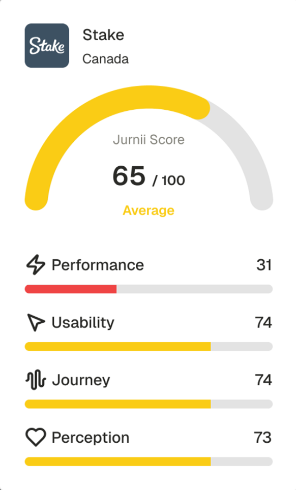 Betty emerged as the strongest overall performer, driven by a high brand perception score from users. BC Game (78) and Stake (74) performed particularly well in user journey effectiveness, supported by clear feature sets and intuitive navigation. However, technical UX performance (including site speed, accessibility, and responsiveness) scored lower across all five brands, pointing to an industry-wide challenge.